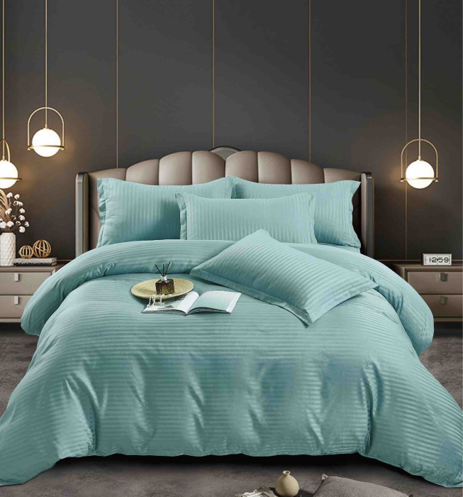 Lenjeria este realizată cu un model discret, format din dungi fine, care oferă un aspect rafinat și modern.