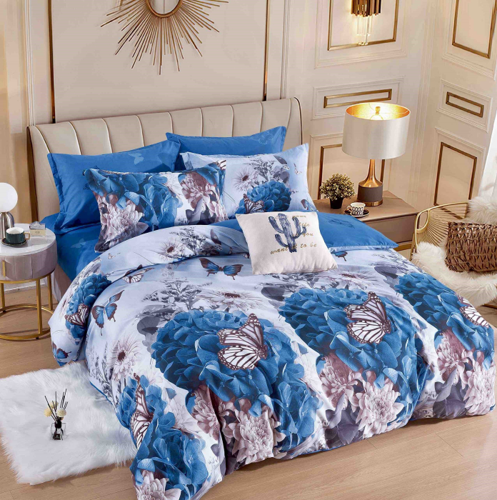 Lenjeria de pat este realizată din bumbac finet, o țesătură mai groasă, moale și plăcută la atingere, ideală pentru utilizare zilnică. Oferă confort sporit și rezistență în timp, menținându-și aspectul chiar și după multiple spălări.