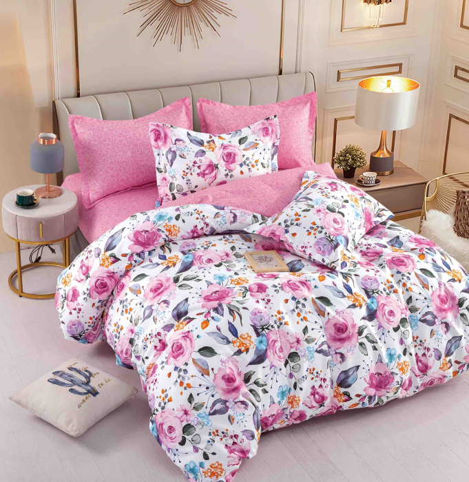 Lenjeria de pat este realizată din bumbac finet, o țesătură mai groasă, moale și plăcută la atingere, ideală pentru utilizare zilnică. Oferă confort sporit și rezistență în timp, menținându-și aspectul chiar și după multiple spălări.