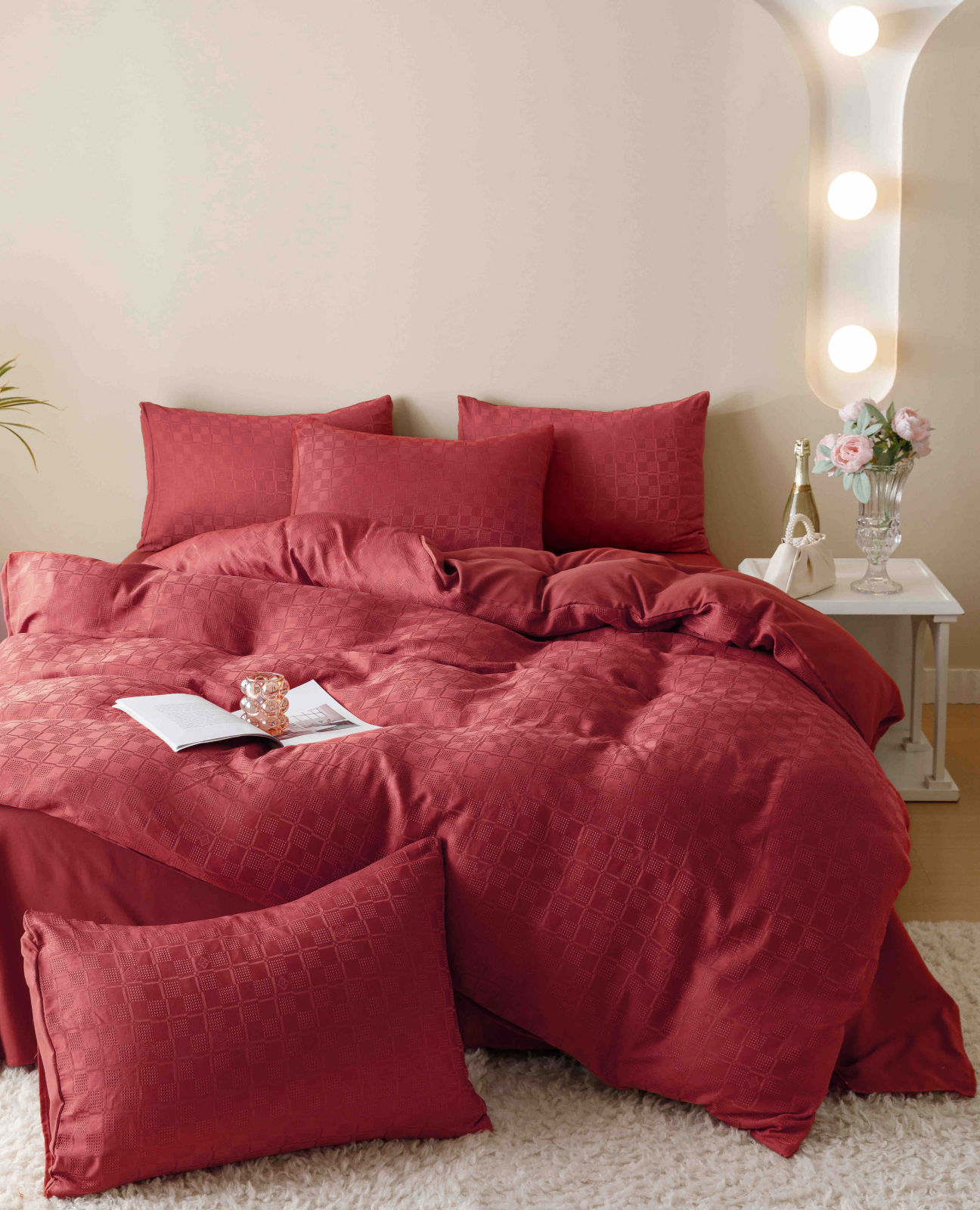 Lenjerie de Pat Dublu 6 Piese din Jacquard Finetat, Rosu