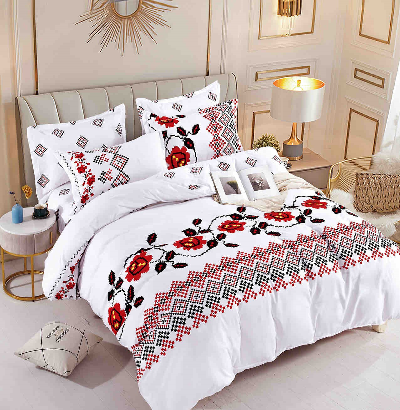 Lenjeria de pat este realizată din bumbac finet, o țesătură mai groasă, moale și plăcută la atingere, ideală pentru utilizare zilnică. Oferă confort sporit și rezistență în timp.
