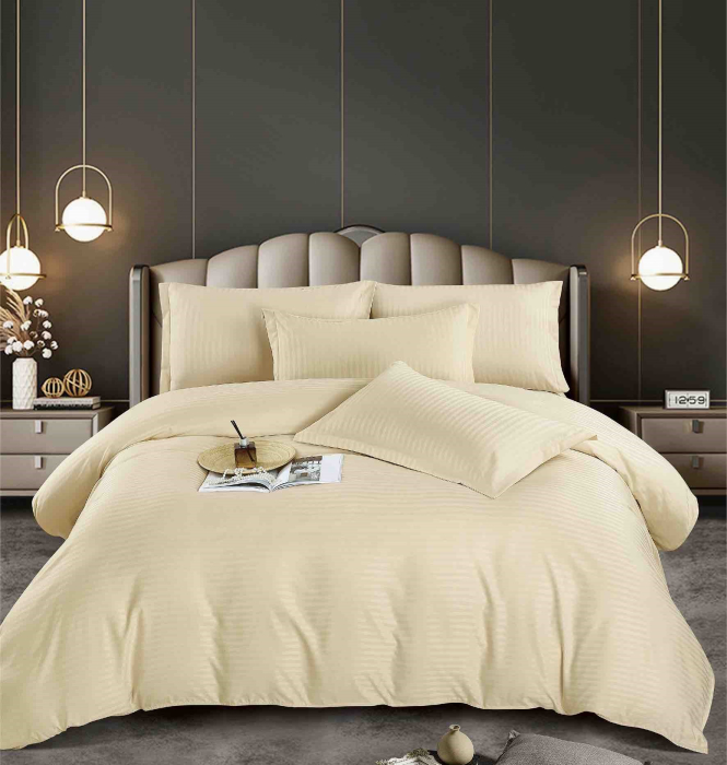 Lenjerie de pat dublu din damasc finetat, cu aspect elegant tip hotel, moale și ușor de întreținut, ideală pentru un dormitor rafinat.